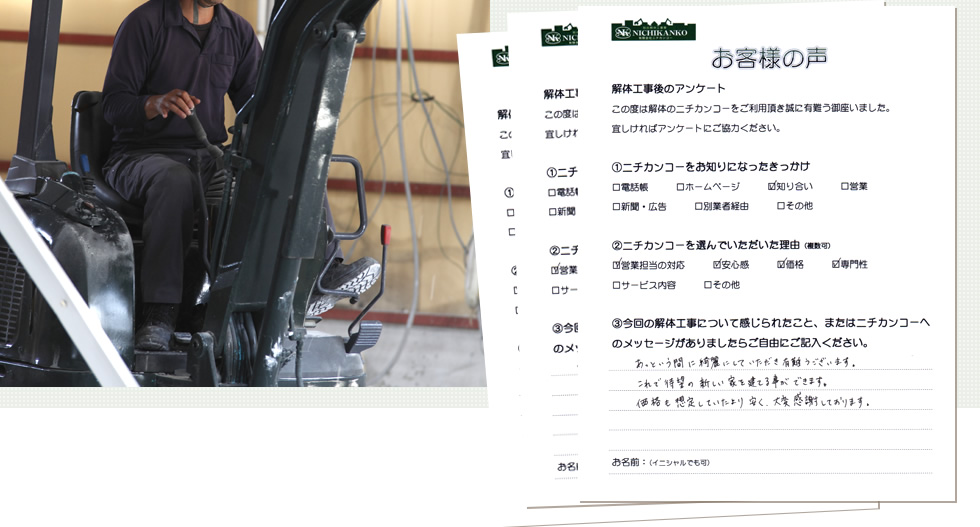 ニチカンコーでは担当者が直接現地に出向き、現場調査をいたします、どの様な現場でどの様な構造かをお調べし、ご依頼人のお話、ご希望、ご心配事を聞き取り、ご安心頂いてから正確に解体を進めさせて頂きます、ですので安心してお見積り相談をしてください。